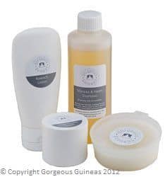 The ingredients are as natural as possible. However, (for example) shampoos and lotions contain water, so need to be preserved to stop bacteria and fungi growing. Parabens are the most commonly used preservatives in cosmetic products, but they have had a bad press. Because of this, I use a different one that is just as effective. There is also no such thing as a “natural detergent” that could practically be used to make shampoo, so the gentle base products that are used for our products are derived from Corn, Sugar and Cocount. Guineas have sensitive skin, so we’ve never used SLS or SLES which are much harsher detergents.