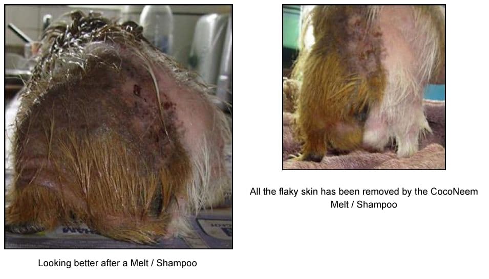 We continued to use the CocoNeem Melt once a week for the next three weeks. The CocoNeem Melt helps to soothe the skin and sores as well as helping to eliminate surface parasites and gently lifting off all the dead skin. There were lots of little sores all over his body, the Mites had infested his head too, causing him to scratch to try and relieve the discomfort. After removing the Melt with Manuka & Neem Shampoo, things were looking better already.